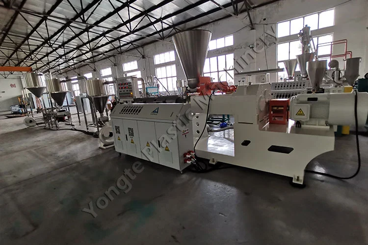 2024-cü ildə biz Polşalı müştəri üçün təkrar emal edilmiş PVC və CaCO₃ doldurucudan PVC masterbatch qranullarını istehsal etmək üçün xüsusi olaraq hazırlanmış xüsusi PVC mürəkkəb qranullaşdırma maşını hazırladıq. CaCO₃ doldurucunun tərkibi müştərinin istehsal xüsusiyyətlərinə uyğunlaşdırmaq üçün 40% ilə 80% arasında çevik şəkildə tənzimlənə bilər. Əsas komponentlərə avtomatik qidalandırıcı, SJSZ80/156 konusvari qoşa vintli ekstruder (ABB tezlik çeviricisi ilə 75 kVt mühərrik, sabit işləmə zamanı ~ 50 kVt enerji sərf edir), vahid qranul kəsmək üçün isti qranullaşdırıcı kalıp və 304 paslanmayan poladdan üç mərhələli sürətli hava soyutma sistemi və ötürücü daxildir. Maşın 300-400 kq/saat istehsal gücünə çatır və sıfır fasilə ilə 24/7 fasiləsiz işləmək üçün qurulub. Quraşdırma problemsiz idi, Yongte-nin ekspert qrupu tərəfindən dəstəklənir və hərtərəfli yardım göstərirdi. Quraşdırıldıqdan sonra, yerində təlim müştərinin heyətinə avadanlığı səriştəli şəkildə idarə etmək üçün səlahiyyət verdi, video təlimat vasitəsilə uzaqdan texniki dəstək isə istənilən problemlərin operativ həllini, fasiləsiz istehsalı və ən yüksək performansı təmin etdi.